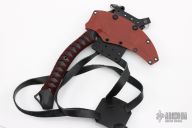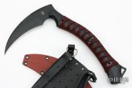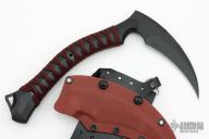 The ReaperTAC from Bastinelli Creations is one cool tool. It's a tactical version of a scythe, an old school tool for reaping crops that has long since been replaced by heavy machinery throughout much of the world. This variation is like a tomahawk in its tactical usage however it incorporates none of its utility functionality. The ReaperTAC measures 9.45" overall with a 6.7" Bohler N690Co stainless steel blade. The recurved shape allows this blade to rip and tear like an elongated talon and the design tapers toward the tip to allow ample penetration power from such a unique tool. The ergonomic handle is made from contoured black G10 with cord wrap and menuki. The ReaperTAC includes a kydex and leather shoulder sheath. Excellent condition. Comes with zippered case.