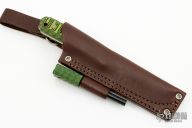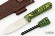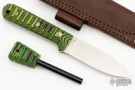 This Genesis by LT Wright features a satin finished flat ground blade with .123" blade stock and 1.187" blade depth, full tang construction. The handle has black/green G-10 scales. Comes with original box, matching firesteel and brown leather sheath. Excellent condition.