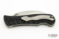 This Elvia Folder by Korth Cutlery features a tumbled hawkbill blade with thumbdisc. The handle has black G-10 scales and backspacer, orange peel finished titanium liners and a tip up titanium clip. Comes with a velcro case and COA. Rides on IKBS, nice detent, lockup and blade seating. Excellent condition.