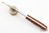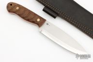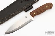 This Sospes by LT Wright features a satin finished scandi ground blade with .187" blade stock and 1.559" blade depth, full tang construction. The handle has brown burlap micarta scales with orange G-10 liners. Comes with original box and brown leather sheath. Excellent condition.
