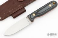 This Bushcrafter by LT Wright features a satin finished drop point blade with .129" blade stock and 1.138" blade depth, full tang construction. The handle has black/grey G-10 scales with lanyard hole at the butt and orange G-10 liners. Comes with brown leather sheath and original box. Excellent condition.