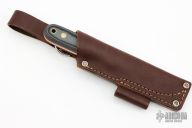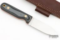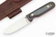 This Bushcrafter by LT Wright features a satin finished drop point blade with .129" blade stock and 1.138" blade depth, full tang construction. The handle has black/grey G-10 scales with lanyard hole at the butt and orange G-10 liners. Comes with brown leather sheath and original box. Excellent condition.