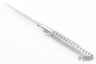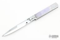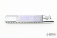 This Picklock Auto by Agasi Hambartsumian of Armenian Doctor Knives features a mirror polished blade. The handle has a polished stainless steel frame with fileworked stainless steel backspacer, dyed bone scales with brass pins. New from maker.