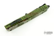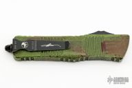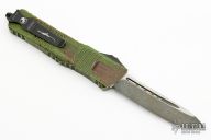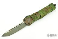 This Combat Troodon OTF automatic by Microtech features a distressed tanto blade with fullers. Outbreak coated Deep Engraved aluminum contoured frame with distressed hardware. Dated 09/2022 S/N 017. Comes with original box and papers. Excellent condition.