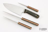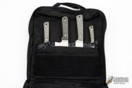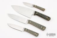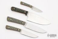LT Wright Handcrafted Knives is a brand that is a phenomenal outdoor/EDC. The 4 pc Camp Kitchen set come in Black Canvas micarta handles with sculpted mountain finish and orange liners. Made with AEB-L steel the Camp Kitchen set has a a 7” chef knife, and three utility knives. It has the Traveller, Large Pouter, and Small Pouter that come with a kydex inserts in the custom carry bag and the blades measure 6”, 5” and 3.5”. This set also comes with a custom wood cutting board. This would be perfect for any kitchen or outdoor trip.