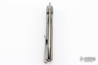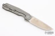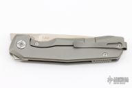 This knife by Kunwu Knives features a satin finished blade with notched thumbrest and flipper. The handle has a textured titanium frame with matching backspacer and tip up clip, mokuti pivot collar. Excellent condition.