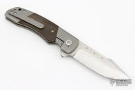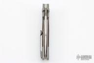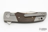 This ESG Bolsterlock from Chad Nell features a satin finish harpoon style blade with copper insets, notched thumbrest and flipper. The handle is comprised of bead blasted titanium frame with green canvas micarta scales over titanium frame, matching bead blasted tip up carry clip. Great blade seating, detent and lock up. Originally from the 2015 USN Gathering. Has a few light scratches, otherwise excellent condition.