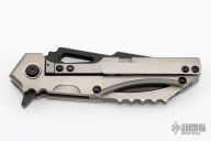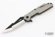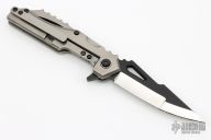 This Raptor by Solid Steel Works features a two-tone multi-ground blade with notched thumbrest, thumbhole and flipper. The handle has a satin titanium frame with black titanium backspacer and tip up clip. "H-10" on backspacer. Has a couple light scratches, otherwise excellent condition.