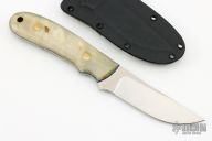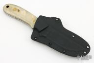 This K-4 Straight Hunter by Dozier Knives features a satin finished blade with notched thumbrest, .138" blade stock and 1.002" blade depth, full tang construction. The handle has sheeps horn scales with brass pins and lanyard hole. Comes with kydex sheath with belt clip. Excellent condition.