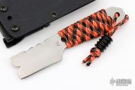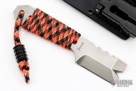 The Bug Out Blade is CPM 3V which is highly resistant to chipping/breaking, an important feature for a tool of this design. The front edge is a pry tool/nail puller and is shaped to provide some scraping/wedging ability, while the bottom edge is very sharp. Roll notched thumbrest. The Bug Out Blade is small enough to carry on your person or in a toolbag, toolbox, etc. Always handy when you need it. Nylon cord wrapped with a lanyard hole and lanyard. Has kydex sheath with a small TekLok, original bag and card. Excellent condition. This one is a lefty, and it is one of 3 in this configuration.
