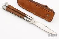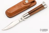 This early balisong from Pacific Cutlery features a Jody Samson ground satin finished blade with swedge. The handles are stainless steel with dovetail ironwood inlays, has t-latch. Comes with original sheath and box. Has some light scuffs and scratches, otherwise excellent condition for its age.