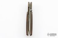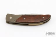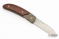 This Baby folder by Bob Terzuola features a Damascus blade with single thumbstud. The handle has a bead blasted and anodized titanium frame and liners with an anodized titanium backspacer and ironwood  scales. Comes with a zippered case. Has a couple light scuffs, otherwise excellent condition.