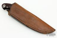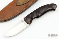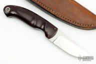 This Hunter by Bob Lum features a hand rub satin finished blade, .123" blade thickness and 1.142" blade depth, full tapered tang. The handle has burgundy linen micarta scales with black liners. Excellent fit and finish. Outstanding work. Comes with a brown leather sheath. Has a couple light scratches, otherwise excellent condition.