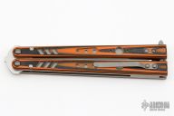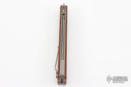 This BRS Replicant features a two-tone finished clip point blade with hand rub satin finish flats and bead blast finish bevels. The handle has a black/orange G-10 over titanium liners and backspacers. Stainless steel T latch. Includes original box. Excellent Condition.