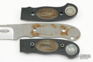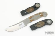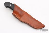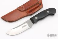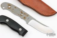 This Survival Skinner by Vaughn Neeley of Timberline Knives features a two-tone semi-skinner style blade with sawteeth on spine and notched thumbrest, .185" blade stock and 1.126" blade depth, full tapered tang construction with black linen micarta scales. Has some scuffs and scratches, otherwise good condition. "016SS" on back of blade. Comes with brown leather sheath with fire steel and tool to take off scales which also doubles as a small arrowhead. Has survival items in the scales.