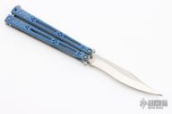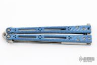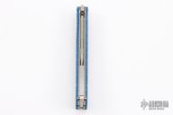 This Basilisk R from HOM Design features a satin finished recurved clip point blade with swedge. The handle is comprised of blue twill scales over titanium liners and stainless steel backspacers. Steel and titanium T latch in pommel. Excellent condition. Comes with original box and COA