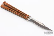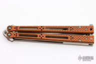 This Basilisk R from HOM Design features a two-tone finished recurved clip point blade with satin flats, acid washed bevels, and swedge. The handle is comprised of orange/black G-10 scales over titanium liners and stainless steel backspacers. Steel and titanium T latch in pommel. Includes Maker's card and original box. Excellent condition.