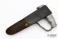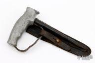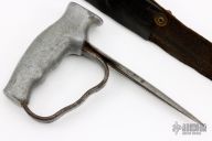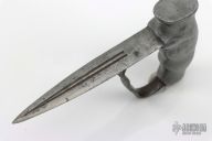 During WWI the firm of Robbins Dudley filled the “Tommy’s” need for easy to use in close quarters fighting knives. Designed for easy manufacture, these knives were all private purchase by individual soldiers. This push dagger was designed for stabbing from behind with a natural movement (great for unskilled knife fighters) with the high carbon steel blade held orientated horizontal to the ground (point is sharp, but edges are not sharpened). Comes with original brown leather holster. Has some light oxidation and pitting, otherwise good condition for its age.
