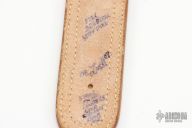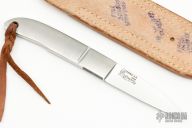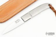 This Loveless style Stiff Horn by Mike Lovett features a mirror finished blade, with an integral handle with a satin finish and mirror polished fluting and edges. Has a lanyard hole and a nice leather pocket sheath. Excellent condition.