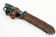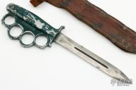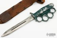 Pattern 1 Everitt trench knife in green.  WWII vintage this piece is in very good condition with about 75% paint retention on handle.  Blade has obviously seen use but in very good condition for the age. Original sheath with all rivets, grommets, and snaps in place. Very hard to find!