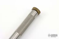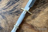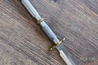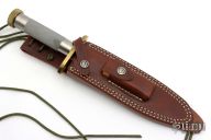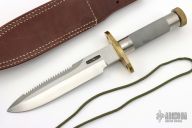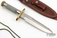 This Model 18-7.5 Attack Survival from Randall Made Knives has a 7.5" blade with sharpened top edge and sawteeth, .247" blade stock and 1.399" blade depth, hidden tang construction. The handle has a brass guard and knurled butt cap, knurled stainless steel handle. Comes with a brown leather sheath and original paper wrapping. New from maker. Comes with a Floyd Byrd 48" stainless steel survival staff.