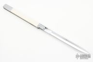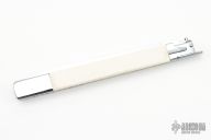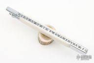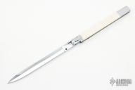 This Picklock Auto by Agasi Hambartsumian of Armenian Doctor Knives features a mirror polished dagger ground blade with a false top edge. The handle has a polished stainless steel frame with fileworked stainless steel backspacer, white bone scales with brass pins. New from maker.