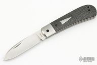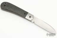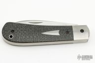 This Zulu Spear by Enrique Pena has a satin finished blade with half-stop and nail nick. The handle has stainless steel bolsters, silver lightning strike carbon fiber covers with red G-10 liners, stainless steel spring and escutcheon. Spring flush in all positions. Comes with zipper case. Excellent condition.