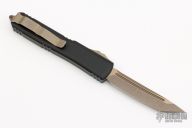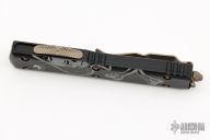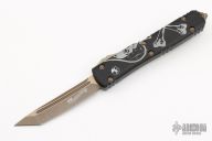 This Ultratech OTF from Microtech features a tanto blade profile and a collectible death card graphic. The blade has a durable bronze apocalyptic finish and a Memento Mori stamp. This model depicts the left half of the Death Card. Microtech equipped this version of the ever popular Ultratech D/A OTF knife with a smooth, contoured handle design that promotes increased comfort during use. This updated model provides the same dimensions, hardware, and durability offered by the "Tri-Grip" variation, but goes easier on the hands and pockets. For those unfamiliar with the Ultratech, it's a fully automatic knife with a double-action out-the-front mechanism, meaning the thumb slide deploys the blade and retracts it as well. The Ultratech knife from Microtech has set the bar for all OTF knives. Excellent condition with original box and papers. Dated 10/2021 s/n 171