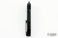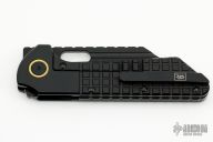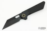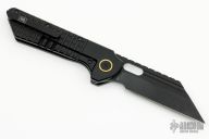 This knife (please let us know if you know who the maker is) features a black blade with fullers, notched spine, thumbhole and flipper. The handle has a black frag pattern frame with anodized titanium pivot collard, black tip up clip and backspacer. Excellent condition.