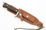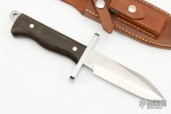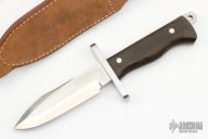 This Randall Style Model 15 Airman by GL Wall features a satin finished blade with a sharpened top edge, .212" blade stock and 1.288" blade depth, full tang construction. The handle has a stainless steel double guard, green canvas micarta border patrol style grip. Comes with a brown leather sheath. Has a few light scratches, otherwise excellent condition.
