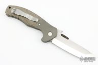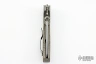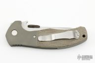 This PoBoy Emerson Roadhouse by Andrew Charlet features a stonewashed blade with notched thumbrest, custom Damascus thumbdisc and wave feature. The handle has bead blast dovetailed titanium bolsters, bead blasted titanium liners, the locking liner is thicker, and green canvas micarta scales, bead blasted titanium backspacer, stainless steel tip up clip. Includes a zippered case. Nice detent, lockup and blade seating. Excellent condition.