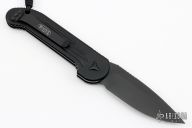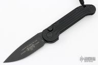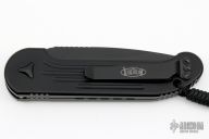 This LUDT side opening automatic by Microtech has a black blade with a standard edge and a black aluminum frame. This tactical version has black fittings. Stainless steel clip. Dated 11/2022 and serial number 28901. Comes with original box and sheath. Excellent Condition.