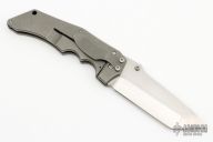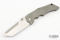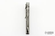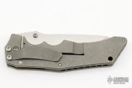 This Villain Framelock from Jim Burke features a satin finished tanto blade with a-symetrical swedge, single thumb stud and notched thumb ramp. The handle is comprised of tumble finish titanium over a notched and g10 backspacer. Titanium tip down clip and lanyard hole in pommel. Great blade seating, detent and lockup. Excellent condition.