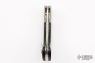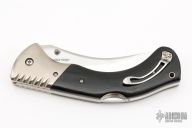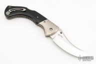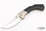 This Black Sable by Cold Steel features a polished, upswept san mai tanto style blade with swedge and dual thumb studs. The handle is comprised of titanium bolsters and black micarta scales over titanium liners and steel backspacer, has holes for a tip up reversible clip, but no clip. Has some light scratches, otherwise excellent condition. Comes with original box and extra clip.