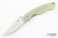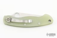 This Military by Spyderco has a satin finished blade with notched thumb rest and thumbhole. Handle is jade G-10, with stainless steel single liner (lock), standoffs, stainless steel tip down clip, and lanyard tube pin. Excellent condition. This knife was a Blade HQ Exclusive. Comes with original box and papers.  Excellent Condition.