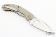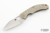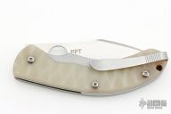 This Perrin PPT from Spyderco has a satin finished CPM S30V stainless steel drop point blade with thumb hole and notched thumb rest. Handle is sculpted g10 over satin stainless steel liners and backspacer. Bead blast stainless steel tip up clip. Knife has been modified. Has some light scuffs and scratches great condition otherwise.