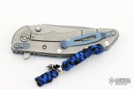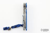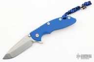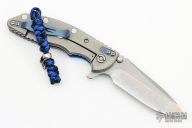 This XM-18 from Hinderer Knives features a stonewash finished drop point blade with dual thumbstuds and notched thumbrest and flipper. The handle has a textured blue G-10 scale and stonewashed titanium frame over titanium barrel spacers, filler tab and tip up clip, lockbar stabilizer.  Includes 4 extra scales, an extra pocket clip and tool.  Light scratches are visible on frame otherwise the knife is in excellent condition.