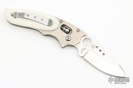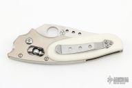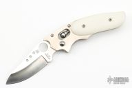 This Phoenix by Spyderco is a Howard Viele Design. The blade is satin finished with thumbhole opening. The handle has a titanium frame with white linen micarta scales, stainless steel backspacer, and a tip up stainless steel clip. Comes with a soft pouch. Has some light scuffs and scratches great condition otherwise.