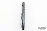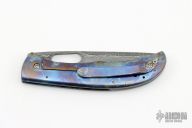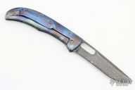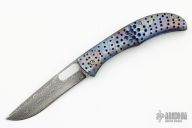 This Small Framelock by Chuck Gedraitis features a Damascus blade with thumbhole. The handle has an anodize finished titanium frame with micarta backspacer, and a tip up matching pocket clip. Comes with zippered case. Excellent condition.