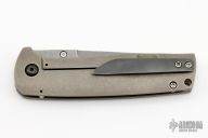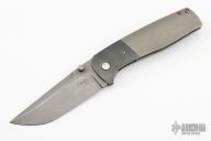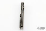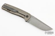 This Ronin from Mr. Curry features a tumble finished blade with notched thumbrest and single thumbstud. The handle is constructed of tumbled titanium with a zirconium bolster and matching pocket clip is positioned for tip up carry. Comes with a soft pouch and patch. Has some scuffs and scratches, great condition otherwise.