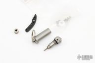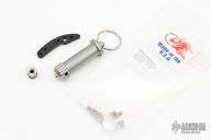 This pocket-size tool kit is a complete disassembly tool for the XM folder. It includes a built-in spanner wrench, which makes it very easy to hold both the wrench and the knife at the same time while making pivot adjustments. The head unscrews from the main body, which contains a precisely machined screwdriver blade that matches the slot on the pivot screw of the XM-18. The head will also hold any standard 1/4″ bit. In the case of the XM-18 it is a 5/64″ hex that works on the handle screws. The crossed drilled hole in the male end is there so you can use it as a “T” handle for extra torque. These are made from 17-4 PH hardened stainless steel, with a bead blast finish. Comes with Extra hinderer hardware and backspacer. Excellent condition.