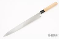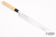This Sushi Knife by Masahiro features a chisel ground laminated steel blade with a hollow ground b-side, .185" blade stock and 1.463" blade depth, hidden tang construction with a wood handle. Comes with original box and papers. Excellent condition.