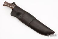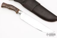This Integral Camp knife by "Anderson" (PLEASE let us know if you know which Anderson this is) features a mirror polished blade with integral bolster, .235" blade stock and 1.975" blade depth, hidden tang construction. The handle has a wood (walnut?) grip covered in silver wire inlay. This knife has over 23 feet of silver wire inlay. Comes with a black leather sheath. The knife is in excellent condition and is stamped with JS signifying that it was made while he was a Journeyman Smith.