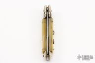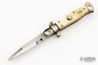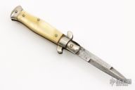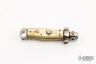 This pick lock auto by Latama is vintage. It features a bayonet ground blade with a false top edge. The handle has nickel silver guard and rear bolster and synthetic gold lip pearl scales, brass liners, steel backspacer with round lock tab. Has nickel silver button and safety. Has some scratches, has oxidation, has a little blade play, fair condition.