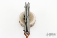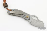This T-Rex by Zhu Homer features a stonewash finish blade with notched thumbrest and a thumbhole. The handle has a milled and tumbled titanium frame, carved titanium backspacer, tip up titanium clip with hidden screws. Nice detent, lockup and blade seating.  Comes with a copper bead and leather lanyard. Also comes with original box. Excellent condition.