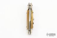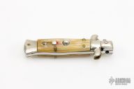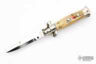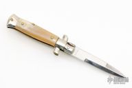 This pick lock auto by Maden Italy. It features a bayonet ground blade with a false top edge. The handle has nickel silver guard and rear bolster and honey horn scales, brass D-stamp liners, steel backspacer with round lock tab. Has nickel silver button and safety. Has some light scratches, otherwise excellent condition.