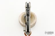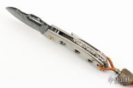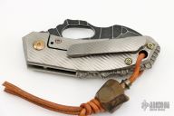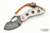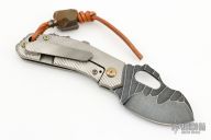 This T-Rex by Zhu Homer features a black acid wash finish blade with notched thumbrest and a thumbhole. The handle has a milled and tumbled titanium frame, carved titanium backspacer, tip up titanium clip with hidden screws. Nice detent, lockup and blade seating.  Comes with a copper bead and leather lanyard. Also comes with original box. Excellent condition.