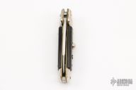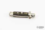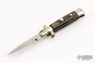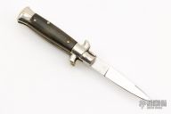 This pick-lock auto by Coricama features a spear point blade with a false top edge. Nickle silver guard and rear bolster and buffalo horn scales. D-stamped brass liners. Nice function, strong firing. Has some light scratches, otherwise excellent condition.