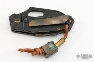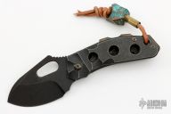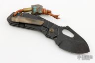 This T-Rex by Zhu Homer features a black tumbled blade with notched thumbrest and a thumbhole. The handle has a black tumbled titanium frame, anodized titanium backspacer, tip up titanium clip with hidden screws. Comes with a copper bead with leather lanyard. Nice detent, lockup and blade seating. Excellent condition. Comes with original box and COA dated NOV 2 2021 and #320.