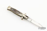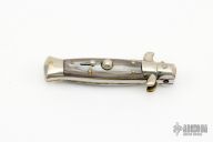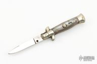 This auto features a spear point blade with a false top edge. Nickle silver guard and rear bolster and buffalo horn scales. D-stamped brass liners. Nice function, strong firing. Has some light scratches, otherwise good condition.
